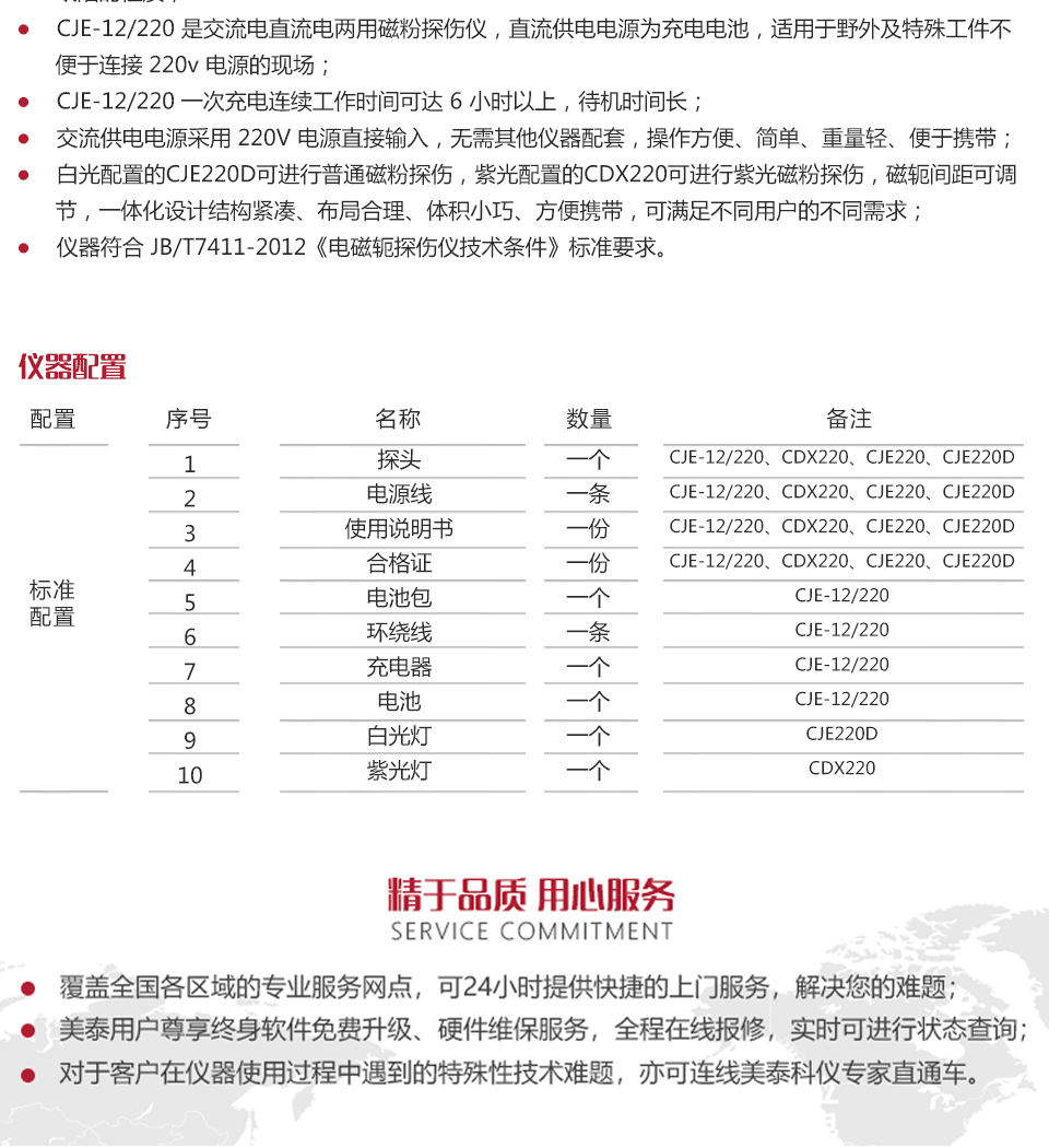 ? CJE-12/220 是交流電直流電兩用磁粉探傷儀,直流供電電源為充電電池,適用于野外及特殊工件不便于連接 220v 電源的現(xiàn)場(chǎng);