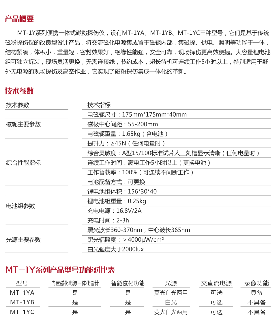 產(chǎn)品概述MT-1Y系列便攜一體式磁粉探傷儀,設(shè)有MT-1YA、MT-1YB、MT-1YC三種型號(hào),它們是基于傳統(tǒng)磁粉探傷儀的改良型設(shè)計(jì)產(chǎn)品,將交流磁化電源集成置于磁軛內(nèi)部,集磁探、供電、照明等功能于一體,結(jié)構(gòu)緊湊,體積小,重量輕,密封效果好,絕緣性能強(qiáng),安全可靠,現(xiàn)場探傷更高效便捷。大容量鋰電池組可獨(dú)立拆裝,現(xiàn)場靈活更換,無需連接線,節(jié)約成本,超長待機(jī)可連續(xù)工作5小時(shí)以上,特別適用于野外無電源的現(xiàn)場探傷及高空作業(yè),它實(shí)現(xiàn)了磁粉探傷集成一體化的革新。