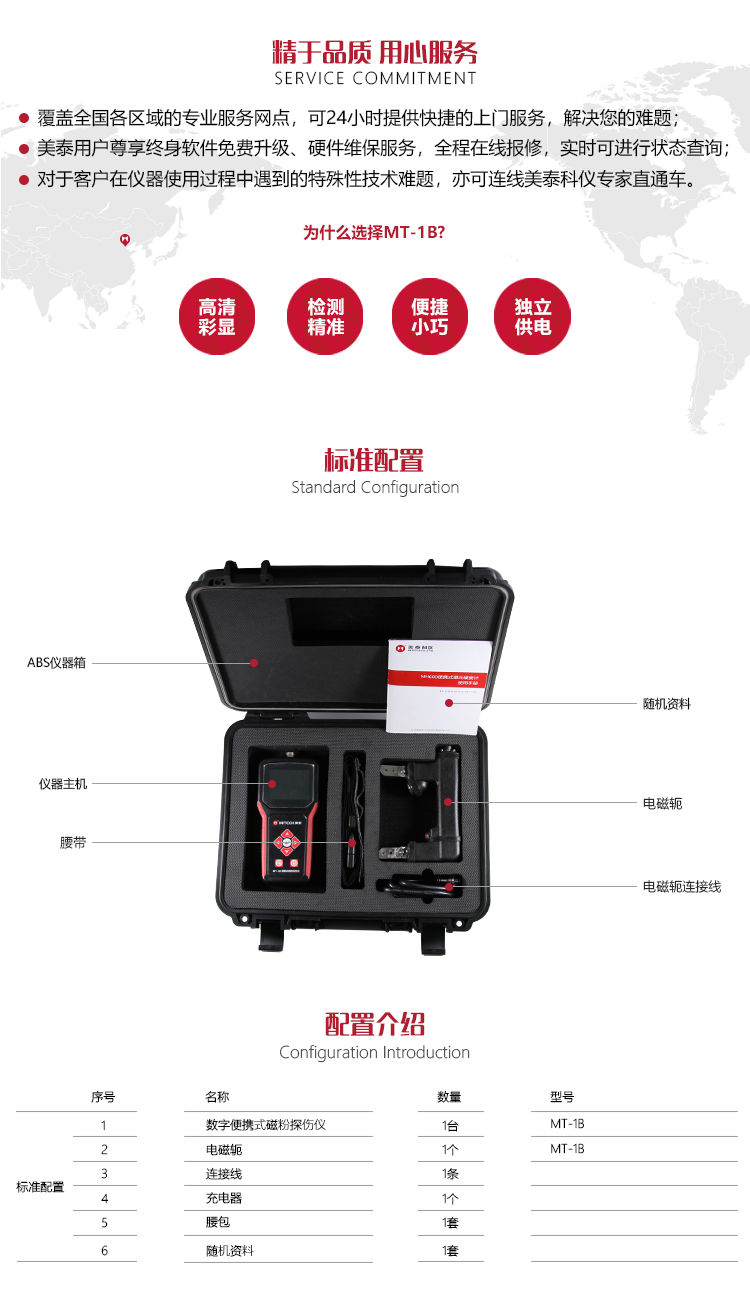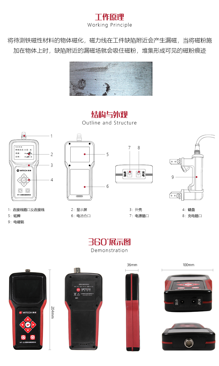 產品概述MT-1B型便攜式磁粉探傷儀,采用大容量鋰電池組供電,將充電電池提供的直流電經過變頻逆變和信號移相處理,為磁粉探傷儀提供磁化電源,解決了傳統磁粉探傷儀依賴220V電源的弊端;功耗低,一次充電可連續工作4小時以上,電池可以在線充電和脫機充電。特別適用于野外無電源的現場探傷及高空作業,它實現了磁粉探傷數字化的革新。