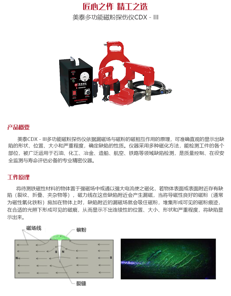 工作原理將待測鐵磁性材料的物體置于強磁場中或通以強大電流使之磁化,若物體表面或表面附近存有缺陷(裂紋、折疊、夾雜物等),磁力線在這些缺陷附近會產(chǎn)生漏磁,當將導磁性良好的磁粉(通常為磁性氧化鐵粉)施加在物體上時,缺陷附近的漏磁場就會吸住磁粉,堆集形成可見的磁粉痕跡,在合適的光照下形成可見的磁痕,從而顯示出連續(xù)性的位置、大小、形狀和嚴重程度,將缺陷顯示出來。
