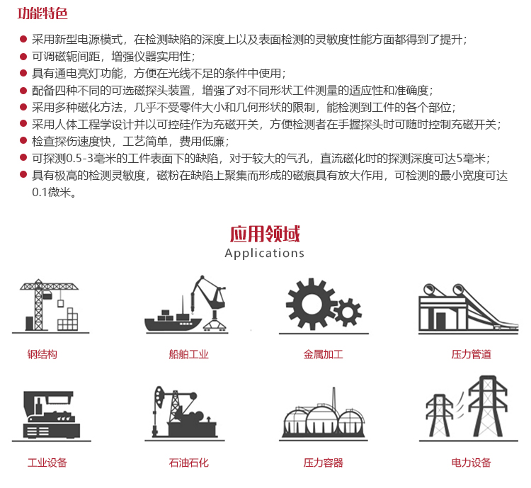 功能用途飛機制造、鍋爐壓力容器、電力、油田、造船、汽輪機和內(nèi)燃機配件、煤礦、機械、標準件、油泵油嘴、汽車零件、造橋、化工、鐵路、大型機械零部件、鋼結(jié)構(gòu)設(shè)備等行業(yè)產(chǎn)品;因鍛壓、淬火、焊接、疲勞等引起的表面及近表面缺陷,如鏈桿、曲軸、軸承、高強度螺栓、彈簧、鍛件、石化管件、閥門、葉片、齒輪、錨鏈以及焊縫等幾何形狀復(fù)雜的工件等。