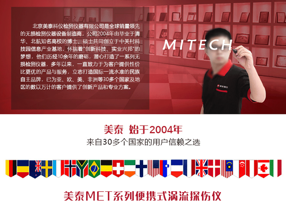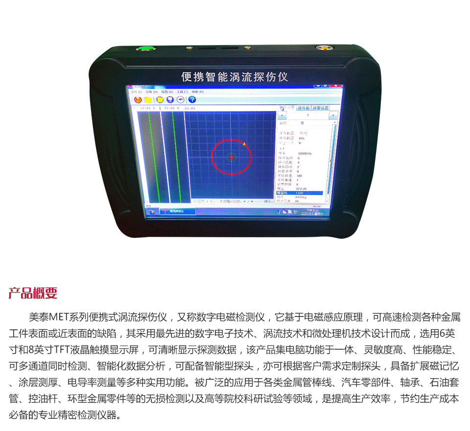 產品概述美泰MET系列便攜式渦流探傷儀,又稱數字電磁檢測儀,它基于電磁感應原理,可高速檢測各種金屬工件表面或近表面的缺陷,其采用最先進的數字電子技術、渦流技術和微處理機技術設計而成,選用6英寸和8英寸TFT液晶觸摸顯示屏,可清晰顯示探測數據,該產品集電腦功能于一體、靈敏度高、性能穩定、可多通道同時檢測、智能化數據分析,可配備智能型探頭,亦可根據客戶需求定制探頭,具備擴展磁記憶、涂層測厚、電導率測量等多種實用功能。被廣泛的應用于各類金屬管棒線、汽車零部件、軸承、石油套管、控油桿、環型金屬零件等的無損檢測以及高等院校科研試驗等領域,是提高生產效率,節約生產成本必備的專業精密檢測儀器。