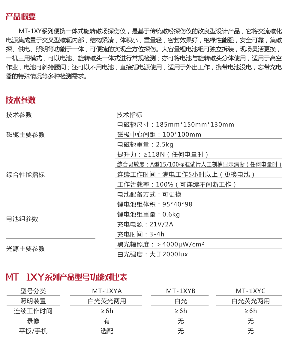 l 無需外接電源即可產生穩定的交流磁場,保證探傷檢測靈敏度,具備白光源和紫外光源等多種光源照明,可進行普通磁粉探傷,也可進行熒光磁粉探傷,使磁粉探傷更簡單、方便、高效、安全。