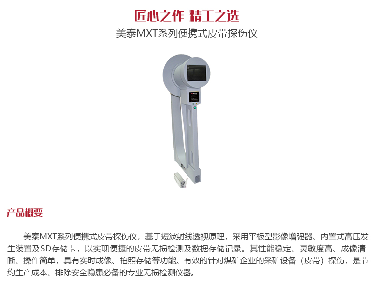 產品概述美泰MXT系列便攜式皮帶探傷儀,基于短波射線透視原理,采用平板型影像增強器、內置式高壓發生裝置及SD存儲卡,以實現便捷的皮帶無損檢測及數據存儲記錄。其性能穩定、靈敏度高、成像清晰、操作簡單,具有實時成像、拍照存儲等功能。有效的針對煤礦企業的采礦設備(皮帶)探傷,是節約生產成本、排除安全隱患必備的專業無損檢測儀器。