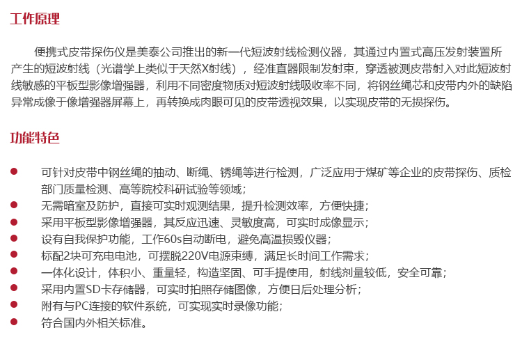 工作原理便攜式皮帶探傷儀是美泰公司推出的新一代短波射線檢測儀器,其通過內置式高壓發射裝置所產生的短波射線(光譜學上類似于天然X射線),經準直器限制發射束,穿透被測皮帶射入對此短波射線敏感的平板型影像增強器,利用不同密度物質對短波射線吸收率不同,將鋼絲繩芯和皮帶內外的缺陷異常成像于像增強器屏幕上,再轉換成肉眼可見的皮帶透視效果,以實現皮帶的無損探傷。