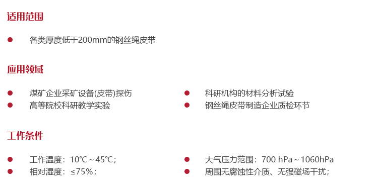 儀器特點可針對皮帶中鋼絲繩的抽動、斷繩、銹繩等進行檢測,廣泛應用于煤礦等企業的皮帶探傷、質檢部門質量檢測、高等院校科研試驗等領域;