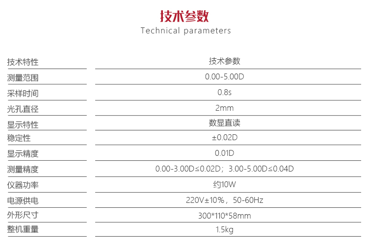 | 測量精度 | 0.00-3.00D≤0.02D;3.00-5.00D≤0.04D |