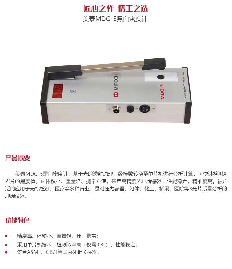 產(chǎn)品概述美泰MDG-5黑白密度計,基于光的透射原理,經(jīng)模數(shù)轉(zhuǎn)換至單片機進行分析計算,可快速檢測X光片的黑度值,它體積小、重量輕、攜帶方便,采用高精度光電傳感器,性能穩(wěn)定,精準度高。被廣泛的應(yīng)用于無損檢測、醫(yī)療等多種行業(yè),是對壓力容器、船體、化工、橋梁、醫(yī)院等X光片質(zhì)量分析的理想儀器。