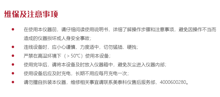 l 請勿擅自拆裝本儀器,維修相關事宜請聯系美泰科儀售后服務部,4000600280。