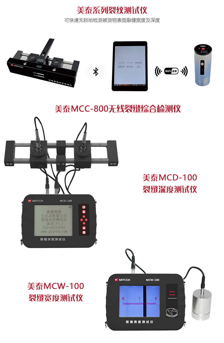 產品概述美泰MCC-800無線型裂縫綜合檢測儀,集裂縫測寬和測深的功能于一體,通過無線信號傳輸,可自動識別多種探頭,能夠快速無損檢測構件表面裂縫寬度及深度。其測量速度快、測量精度高、性能穩定可靠,可實現自動測量,自動判讀及存儲,被廣泛的應用于橋梁、隧道、塔、建筑物、混凝土構件、路面等領域的工程質量檢測,是保障生命財產安全必備的專業精密檢測儀器。