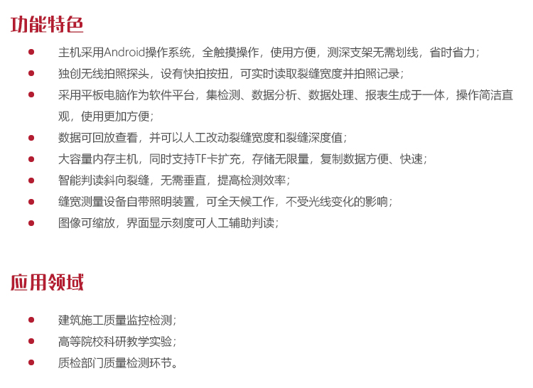 功能用途l 廣泛應用于橋梁、隧道、塔、建筑物、混凝土構件、路面、非金屬構件表面等裂縫寬度及深度檢測;